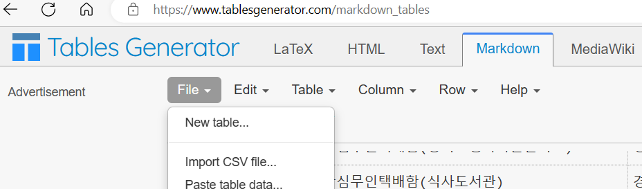 1. Tables Generator 링크로 들어가서 HTML 또는 Markdown 등 원하는 변환 형태를 선택합니다.