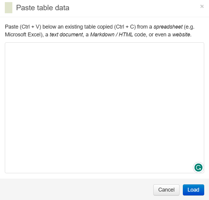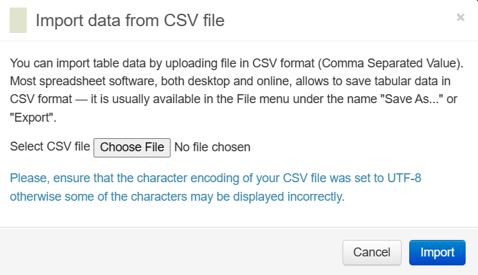 You can import table data by uploading file in CSV format (Comma Separated Value). Most spreadsheet software, both desktop and online, allows to save tabular data in CSV format — it is usually available in the File menu under the name "Save As..." or "Ex