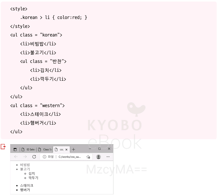 (3) 클래스 선택자: 태그 종류에 상관없이 같은 클래스 이름을 가진 모든 요소에 접근하는 방식. <style> 태그 안에서 .클래스명으로 지정.