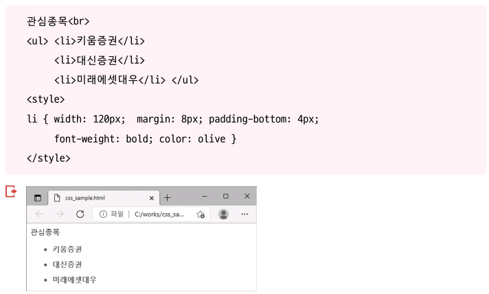 - CSS 스타일 지정 방법: 속성과 값의 구분은 콜론(:)을 사용, 항목 간 구분은 세미콜론(;)을 사용. (파이썬 딕셔너리 자료형과 유사)