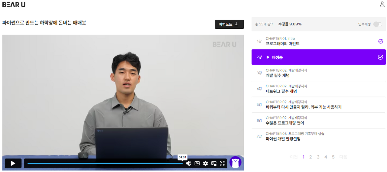 1강도 3분 분량이었기 때문에 챕터 1이 1강 2강으로 나뉘는 것이 아닌 1강으로 끝났다면 2일차에는 챕터 2 개발배경지식을 배우기 시작했을텐데 아직 OT 단계에 그쳤습니다.