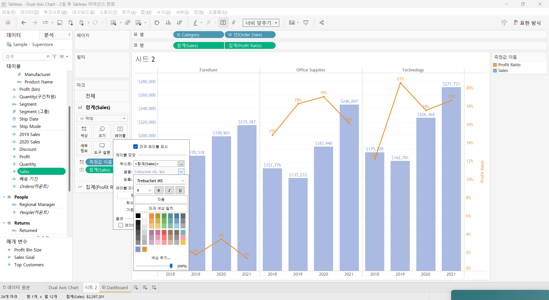 마크를 라인 차트 대신 영역 차트로 바꿔주면 겹치지 않게 trend, 카테고리 전체 합계, 합계 내에서 구성 비율을 볼 수 있다.
