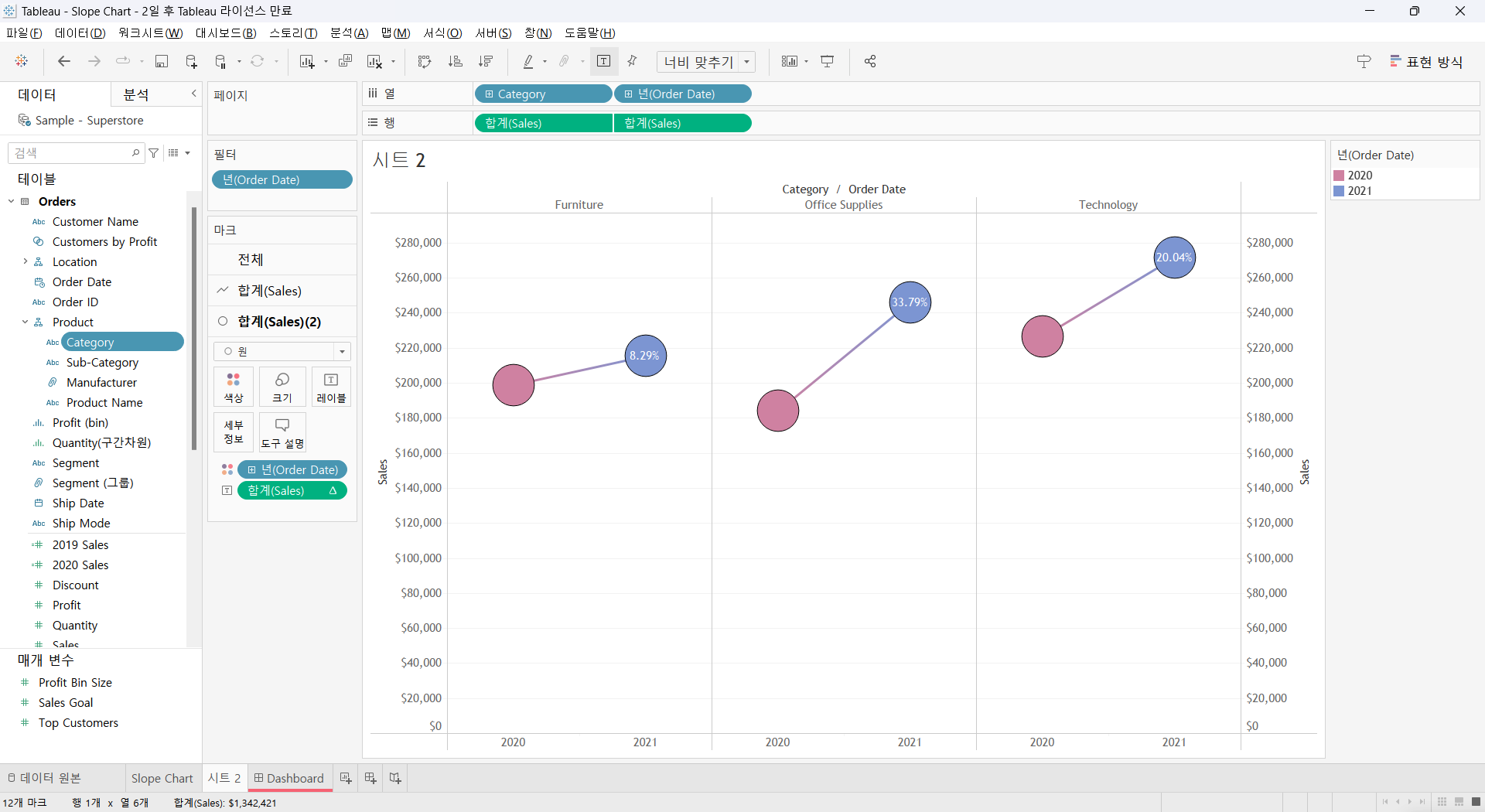 Order Date 2021년 1년간으로 설정함