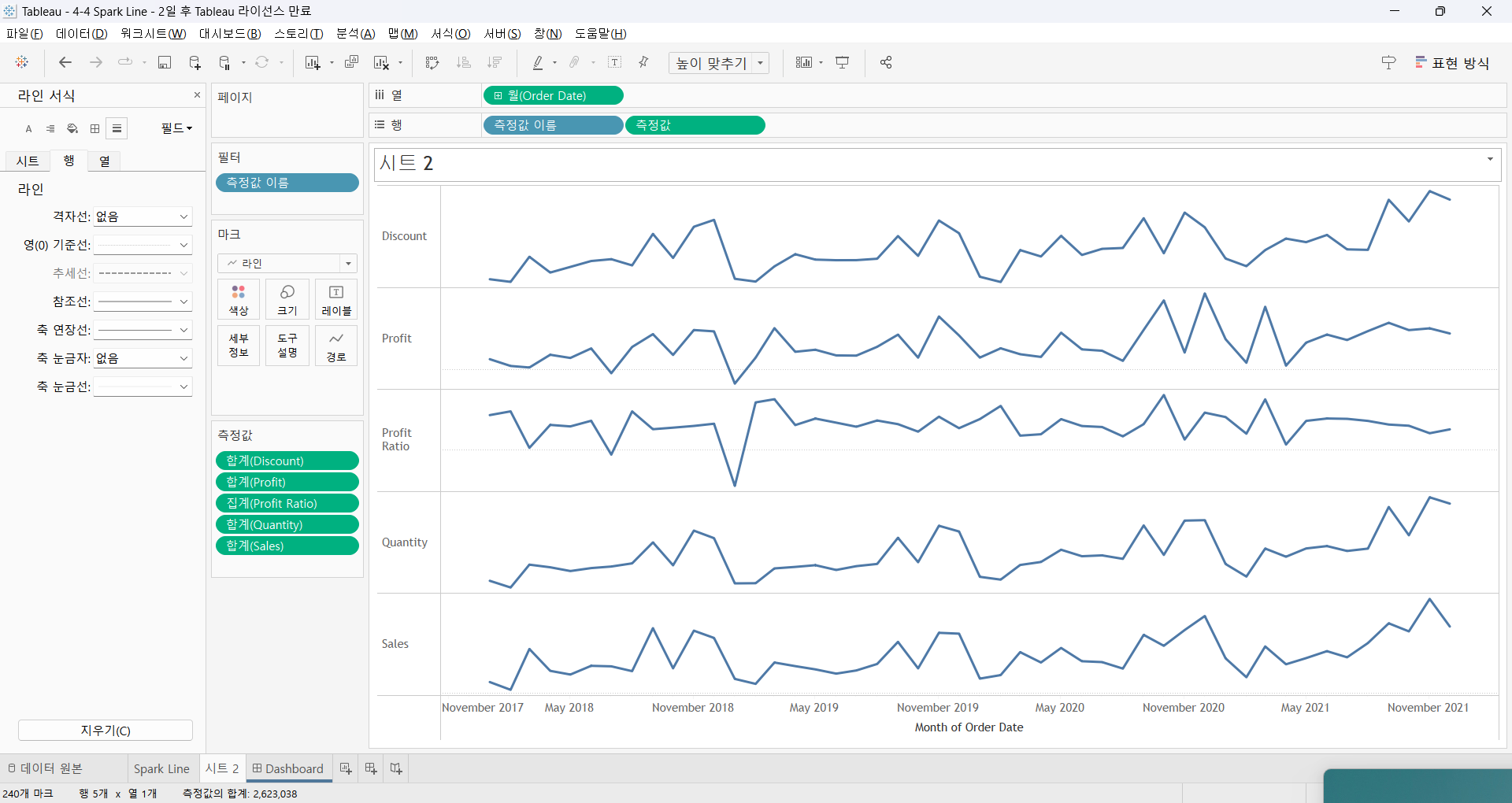 필터 카드에 Order Date - 파란색은 불연속형 값