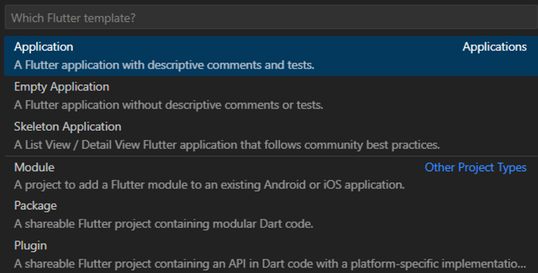 - "flutter"라고 입력 - Application 중에 클릭하여 프로젝트를 저장할 폴더 선택