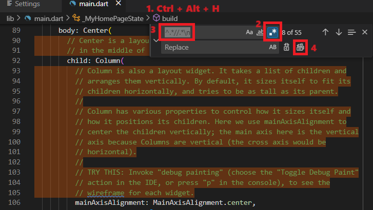 .*아이콘을 클릭하거나Alt + R을 누름). - 찾기 필드에 주석을 일치시키는 정규 표현식 패턴을 사용합니다. 예를 들어, 자바스크립트와 같은 언어에서 한 줄 주석을 위해