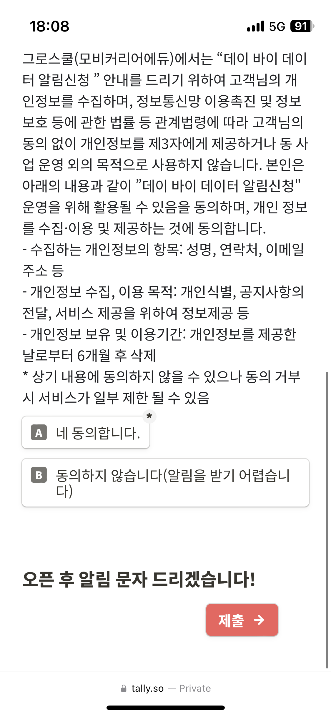 3. 1p. 메인 질문지: 결과 보기 -> 2p. 결과, 상세페이지: 🔔 알림 신청 -> 3p. 알림 받을 개인 정보 페이지: 제출