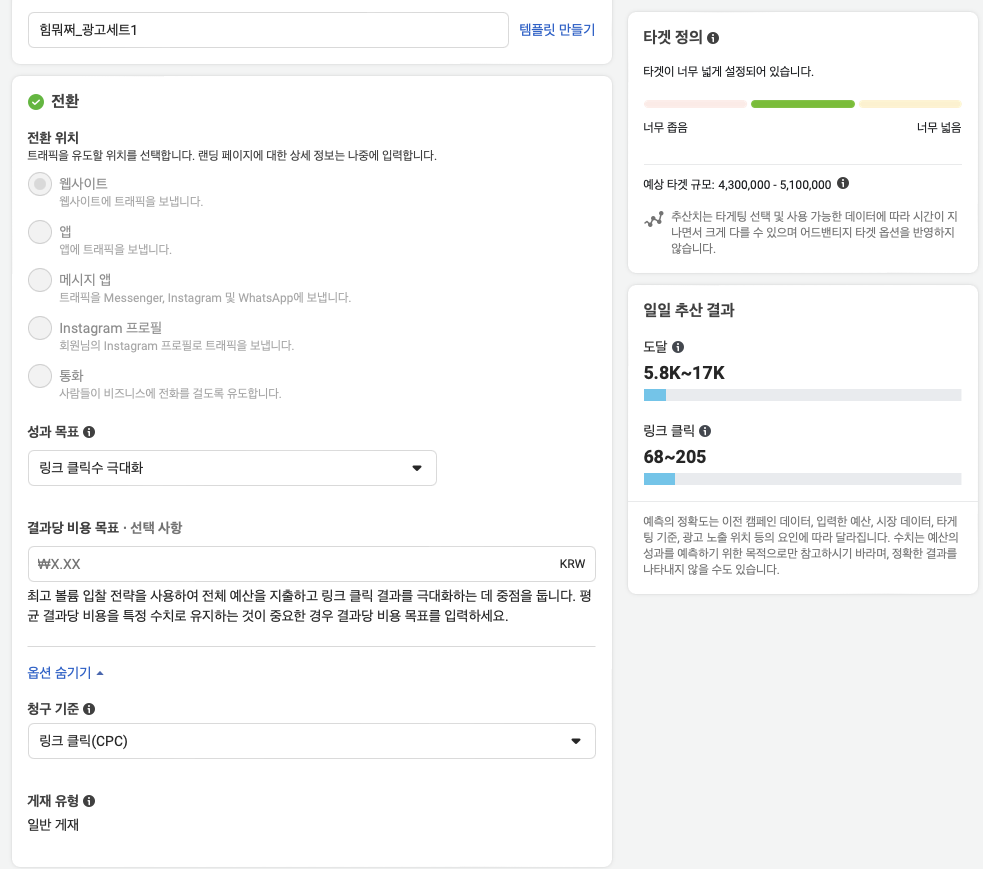 광고 목표 - 전환(상대적으로 단가, 경쟁 더 세다), 방문, 도달