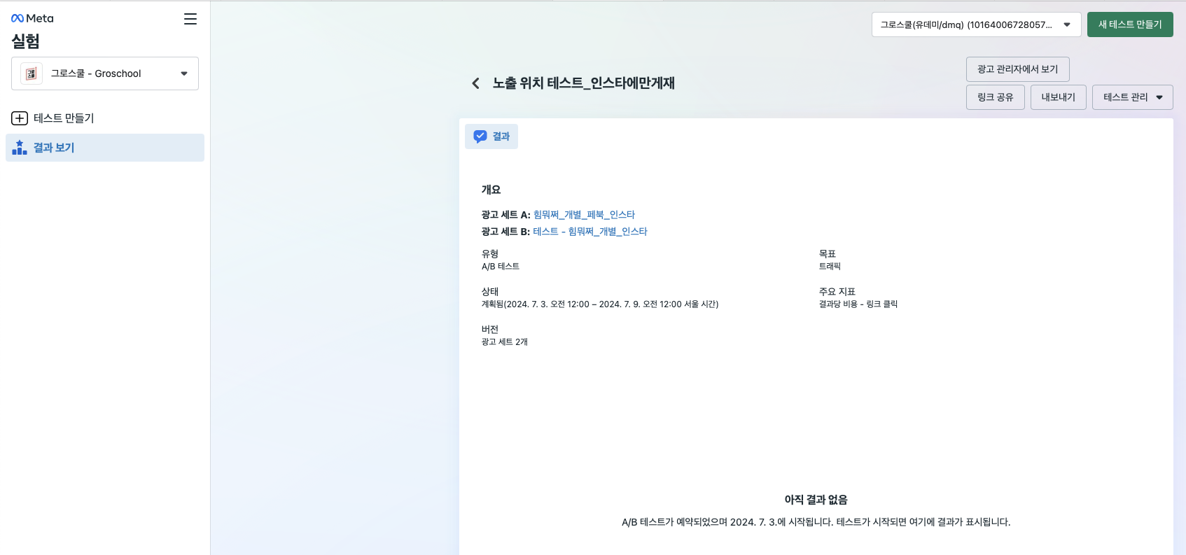 기존 광고는 인스타그램에 비해 페이스북에 압도적으로 많이 노출이 되었기에, 게재 위치에서 페이스북을 선택 해제하고 인스타그램만 선택한다면 인스타그램에 더 많이 노출될 수 있을지 A/B 테스트를 7월 3일 0시부터 시작한다. (테스트를 만든 당일은 테스트 시작일로 지정이 막혀 있기 때문에 다음날로 지정했다.)