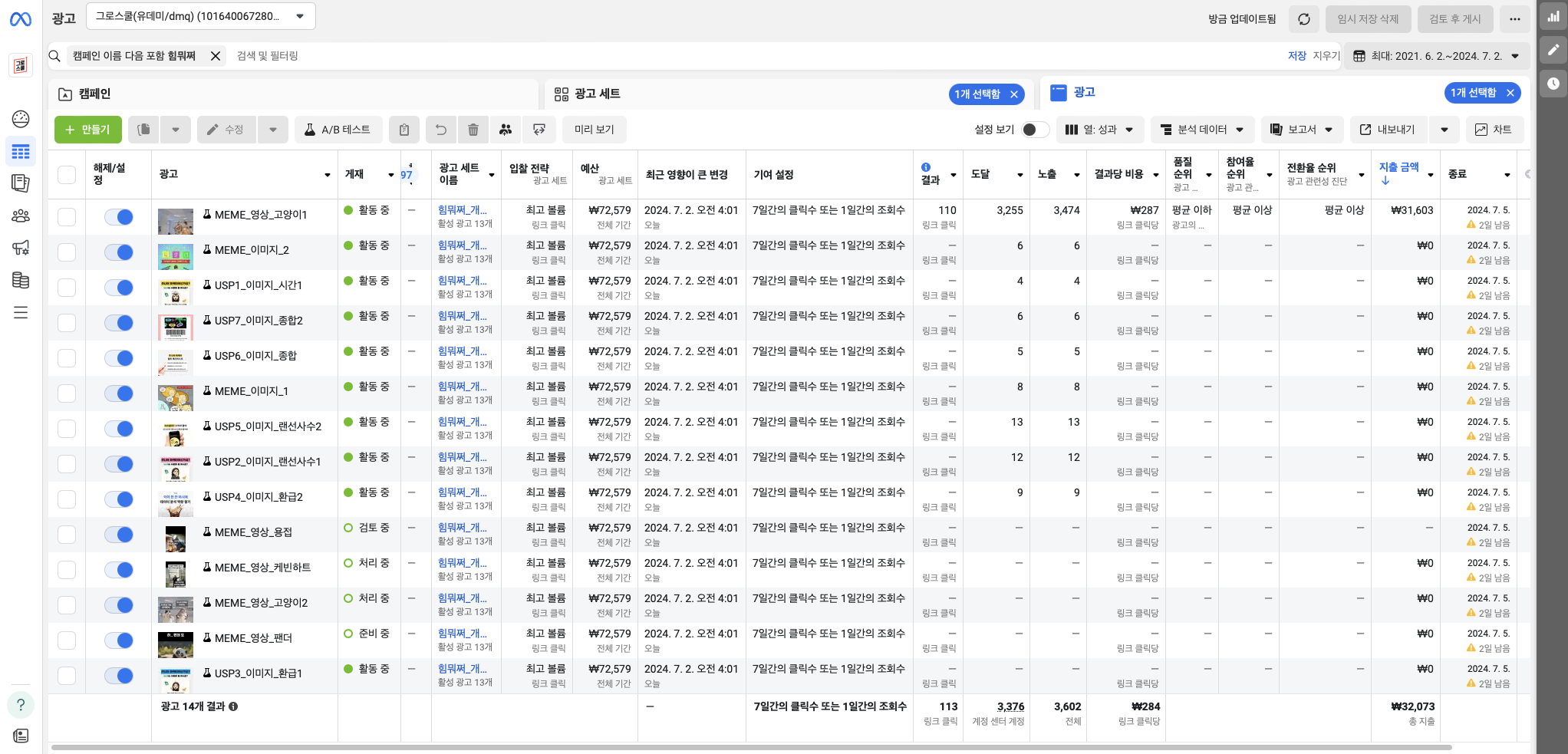 영상과 이미지 중 영상 광고만 결과 수치가 잘 나온 걸 확인한 어제, 약 2시간 동안 영상을 팀원 각자 하나씩 더 제작하였고, 그 영상들을 오늘 광고 세트에 추가했다.