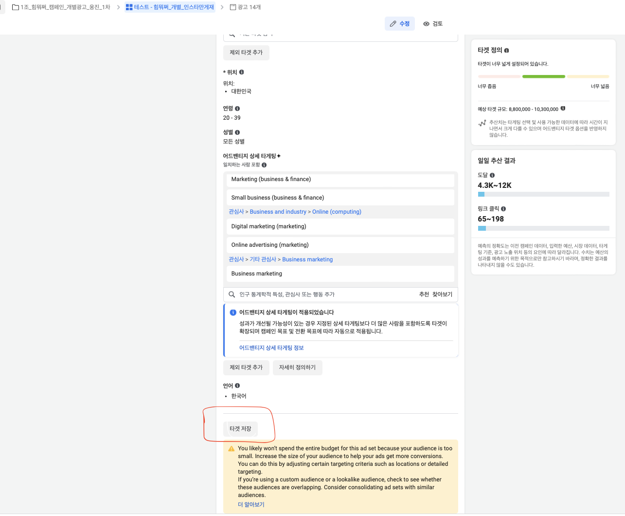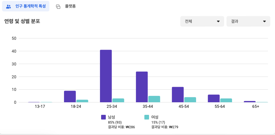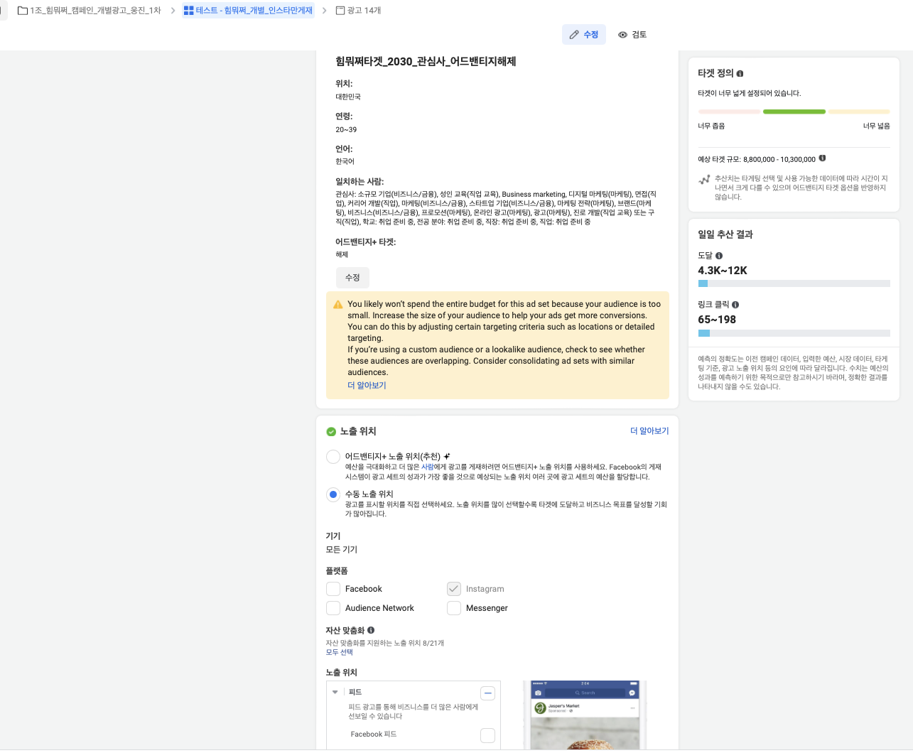 페이스북을 제외한 인스타그램에서의 반응을 먼저 확인하고 나서, 타겟 A/B 테스트를 하기로 결정.