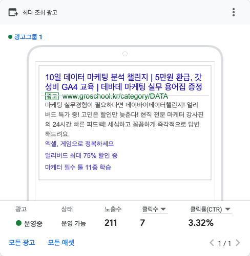 구글 SA 광고 집행 1시간 경과