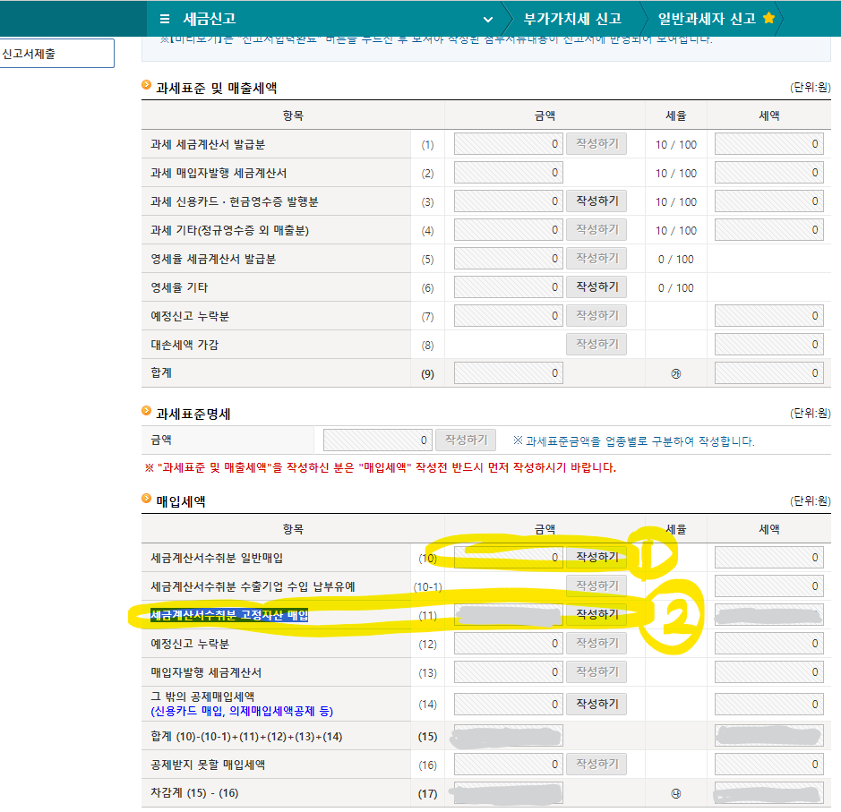2. 일반매입에서 세금계산서 공급가액을 작성 완료 후 고정자산 매입에 같은 금액을 작성 완료하면 일반매입 금액이 0읻 되고 고정자산 매입 금액에만 남겨집니다.