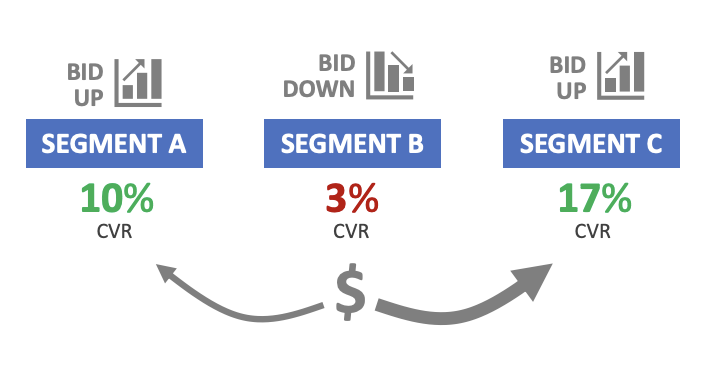 - Segment A: 전환율(CVR)이 10%로 양호하다. 입찰 금액을 올려 더 많은 트래픽을 유도한다.