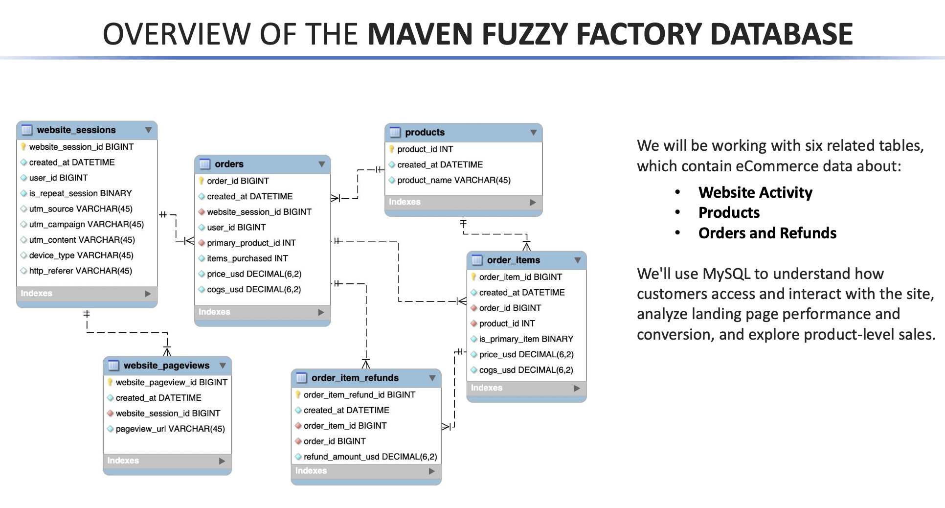 Maven Fuzzy Factory 데이터베이스는 전자상거래(e-commerce)에서 자주 사용되는 데이터를 다룬다. 이 데이터베이스에는 웹사이트 세션, 웹사이트 페이지 뷰, 주문, 주문 항목, 제품, 주문 항목 환불 등의 테이블이 포함되어 있다.